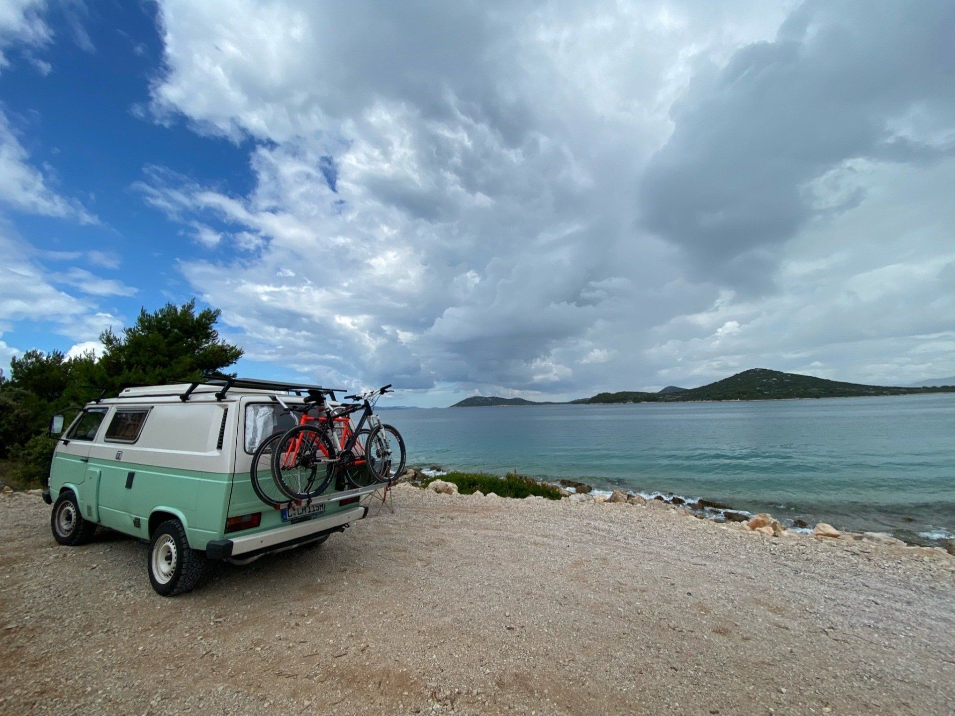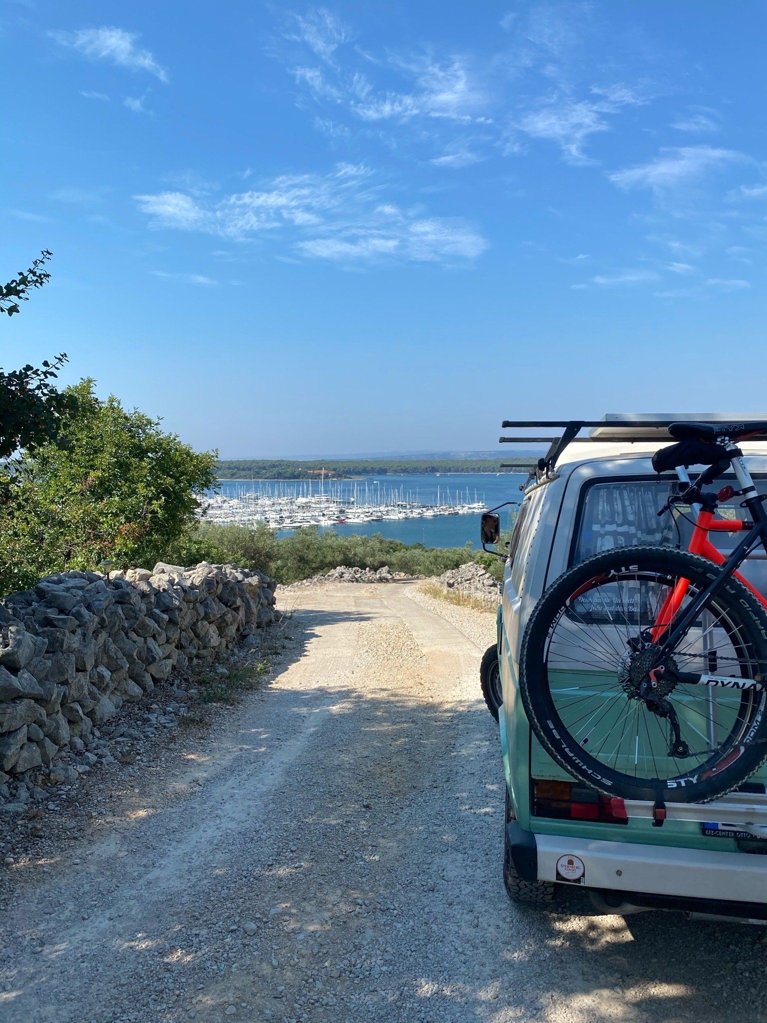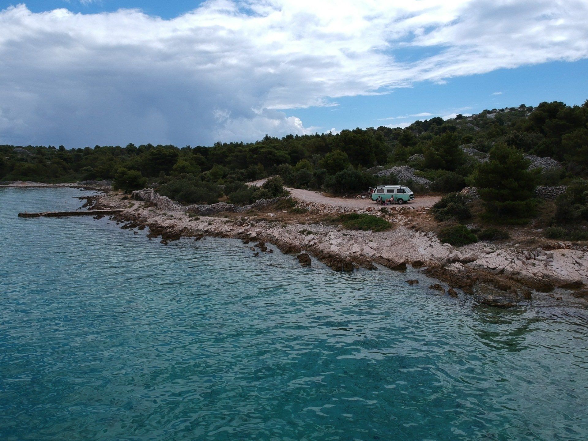 Auf dem Weg dahin machten wir noch einen Stop in Murter und fuhren endlich mal ein paar Kilometer unbefestigte Straßen. Wir hatten Glück und wählten den richtigen Weg in Richtung Meer, sodass wir am letzten Zipfel Murters in eine Sackgasse direkt am Meer gelangten. Wir ließen unsere Drohe steigen und aßen in der Sonne unser Mittagessen, bevor wir uns auf den Weg zur Fähre machten. Als wir dort verweilten kamen die ortsansässigen Fischer mit dem Boot vorbei und freuten sich total unsere Berta zu sehen. Sie winkten uns und gaben uns mehrfach per Handzeichen zu verstehen, dass sie den Van mehr als toll finden :)