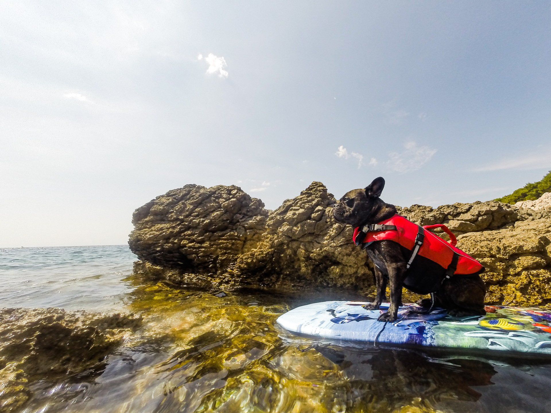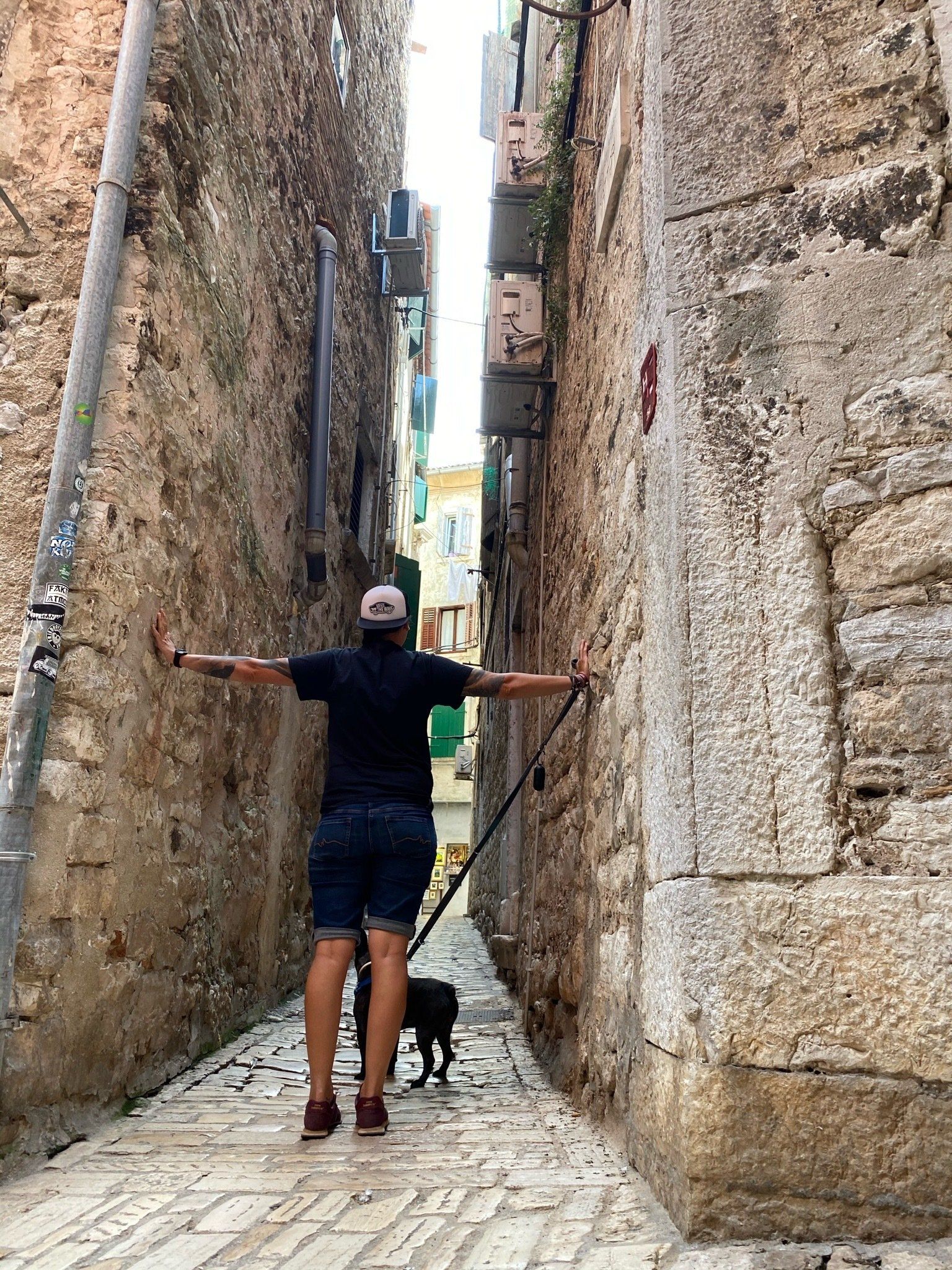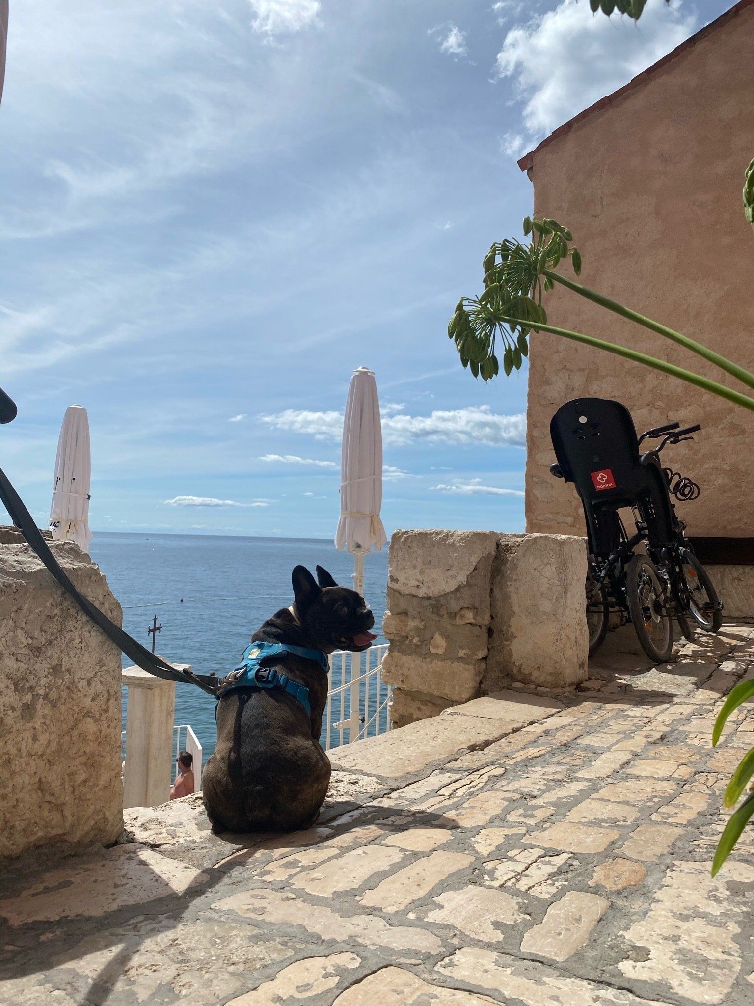 Die kleine Stadt an der Küste ist wundervoll. Viele kleine Gassen, Konobas und immer wieder ein Stand, der zum Verweilen einlädt. Trotz Hauptsaison hatte man keineswegs das Gefühl, die Stadt sei überlaufen. Wir fanden um die Mittagszeit ein kleine Konoba mit Blick auf das Meer, in welcher wir uns einen Balkansalat, Fisch und ein herrlich kühles Pan schmecken ließen. Auf dem Rückweg fanden wir für unseren Hund Popeye endlich auch ein Kindersurfbrett, um ihm die Angst vor den Wellen und der Tiefe des Meeres nehmen zu können. Die Rückfahrt mit dem Ding auf dem Rad auf der Küstenstraße war dann doch sehr abenteuerlich.
