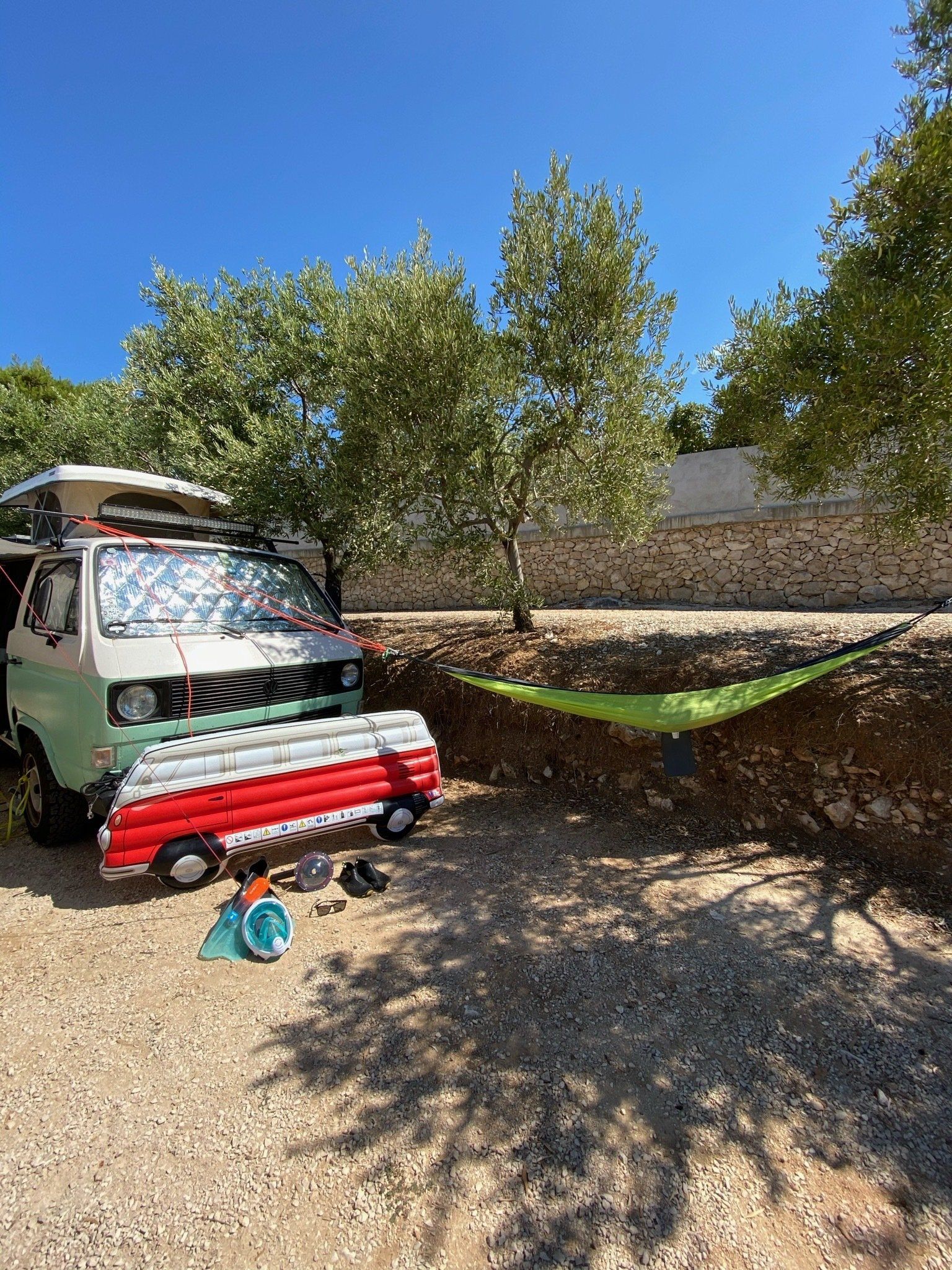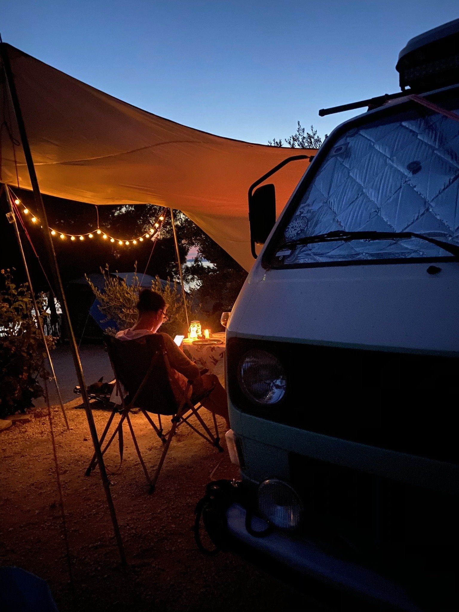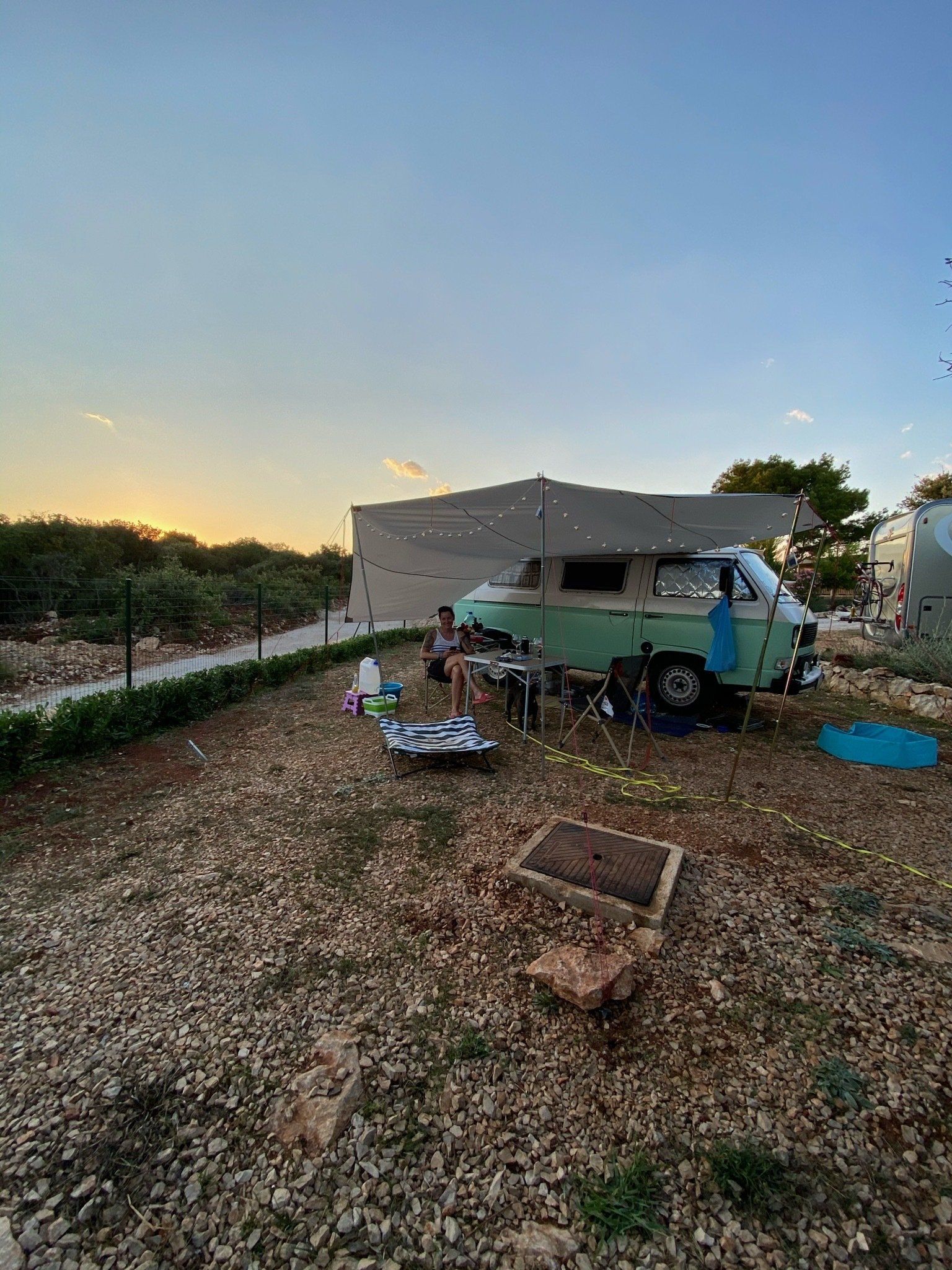 Das schöne an der kroatischen Autobahn ist die Temperaturanzeige… Wir freuten uns über jedes Grad mehr. Unser nächster Spot befand sich kurz vor Primošten im Camp Sunset. Von der Teichstuben bis dorthin waren es nur knapp 490km - also 5,5h mit der Berta. Leider hatten wir an den Grenzen schon knapp 2h verloren. Dennoch waren wir gut in der Zeit als wir gegen 12 Uhr in Grebaštica ankamen, um noch etwas Brot und Gemüse einzukaufen und natürlich Geld zu wechseln. Nachdem wir alles erledigt hatten, lagen noch 8 km vor uns - doch unsere Berta wollte nicht mehr. Sie machte keinen Mucks und sprang nicht mehr an. Meine gute Laune schlug selbstverständlich in Null Komma nix um. Wir riefen unseren Bullischrauber an, der uns mittels Videotelefonie und seelischer Unterstützung half. Erstmal musste aber der ganze Kofferraum ausgeräumt werden, um an den Motor zu kommen. Irgendwie hatte sich das Kabel vom Anlasser leicht gelöst. Wir wackelten etwas daran herum und versuchten es fester dranzustecken und schwupp sprang Berta wieder an, als wäre nichts gewesen. Also packten wir alles, was wir am Straßenrand ausgeräumt hatten, wieder ein und fuhren die letzten paar Kilometer bis zum Camp.