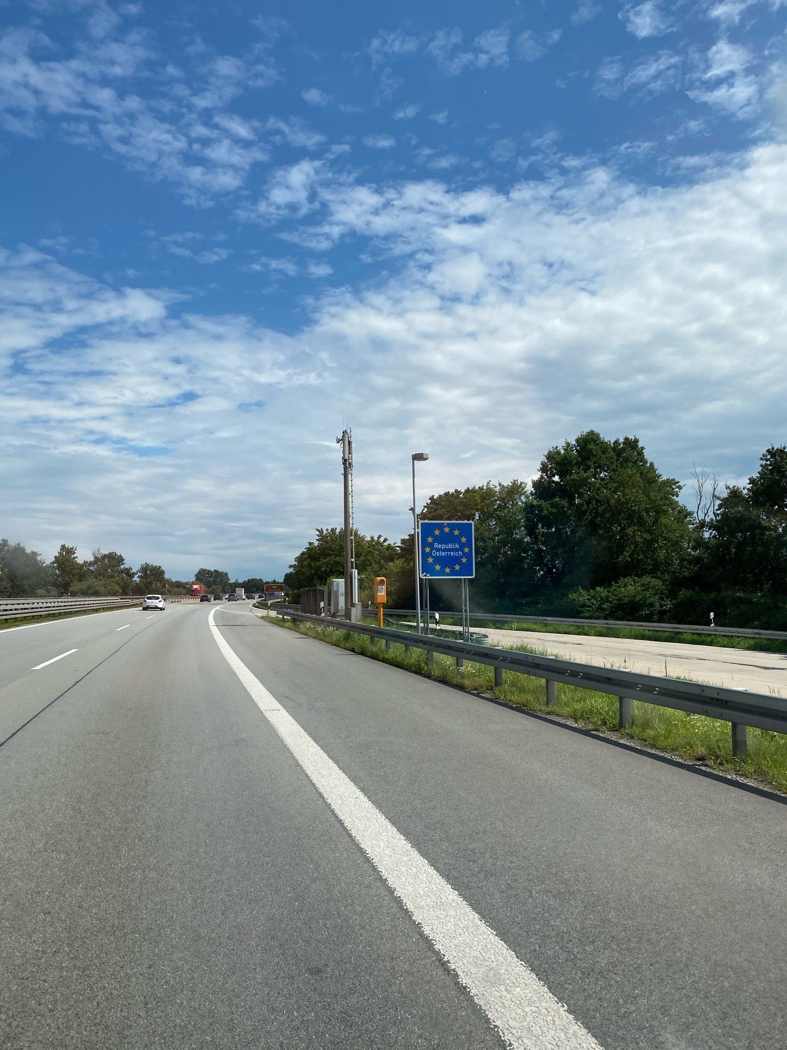 Da sich ja in der aktuellen Zeit die Regeln wie das Wetter ändern, warteten wir mit dem Kaufen der Vignetten bis einen Tag vor Abfahrt. Wir handhaben es immer so, alles vorab zu besorgen, was uns unterwegs Zeit mit Anstehen kosten könnte. Ausserdem wollen wir weitestgehend durchfahren, außer Tank- und Gassipausen für Popeye. Meist liegt unser Wauzi entspannt in seinem Käfig und schläft, da kann man schon mal 1 oder 2 Stunden länger fahren, wenn es gerade rollt.