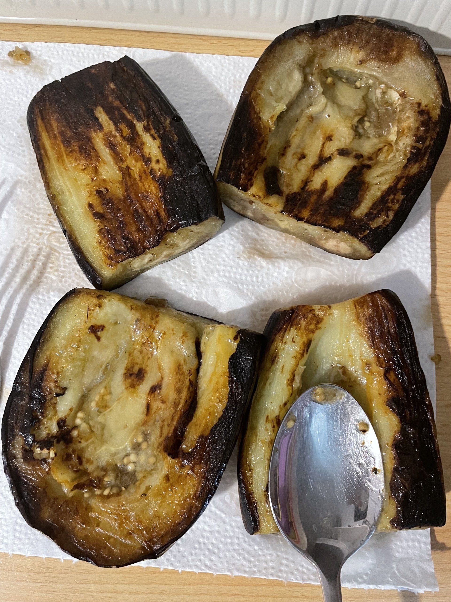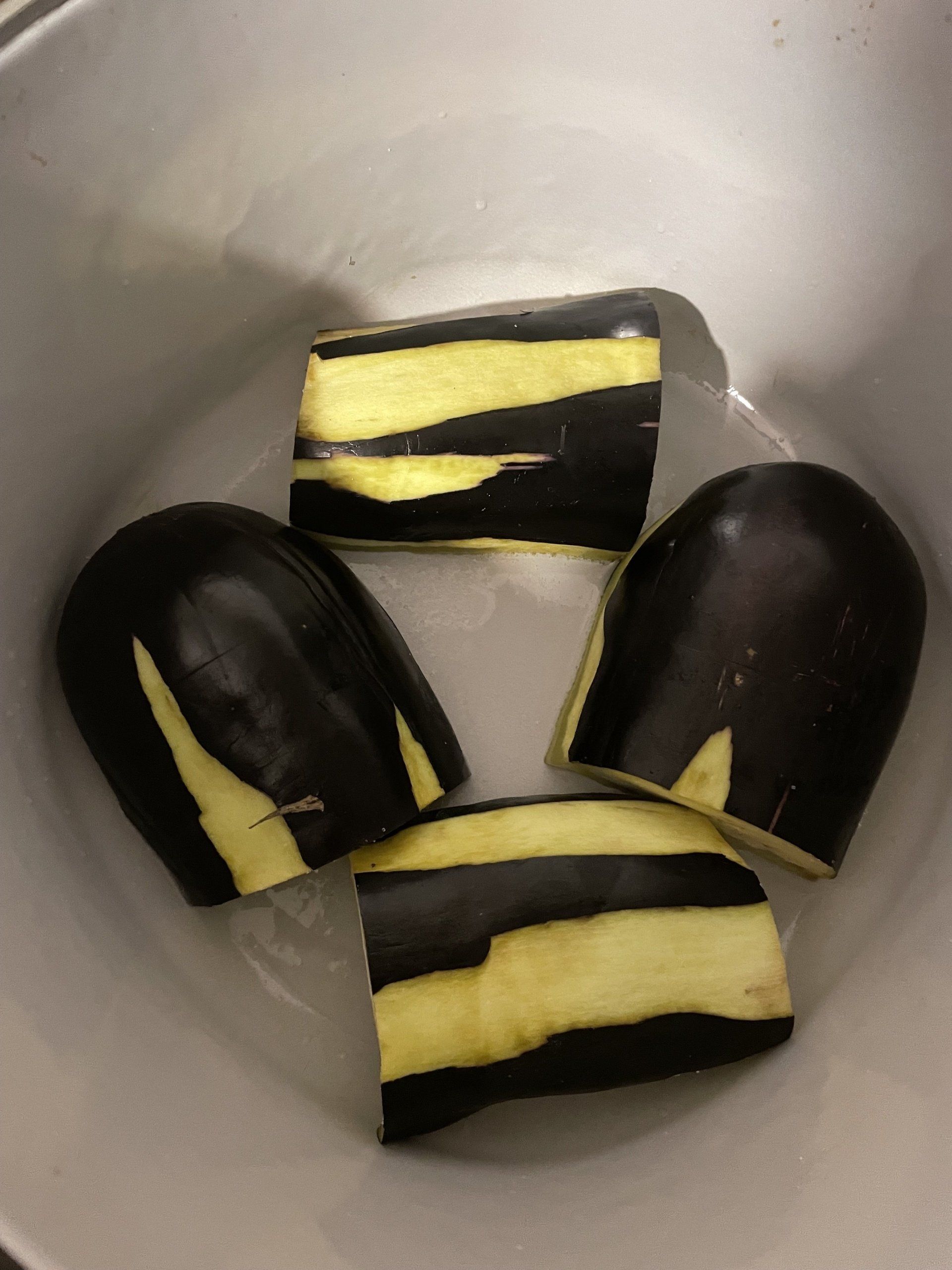 Die Auberginen grob schälen und halbieren. Salzen und auf einem Küchentuch etwas ziehen lassen.